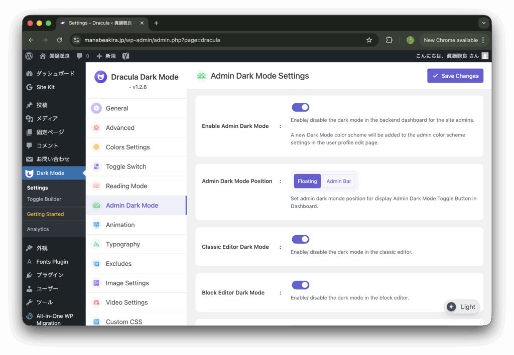 サイトの表示もダークモード対応したい人はそれもできるみたいだけど、オレのサイトは元からダークモード対応してるので、今回はそこは触らずに「Admin Dark Mode」だけ設定します。