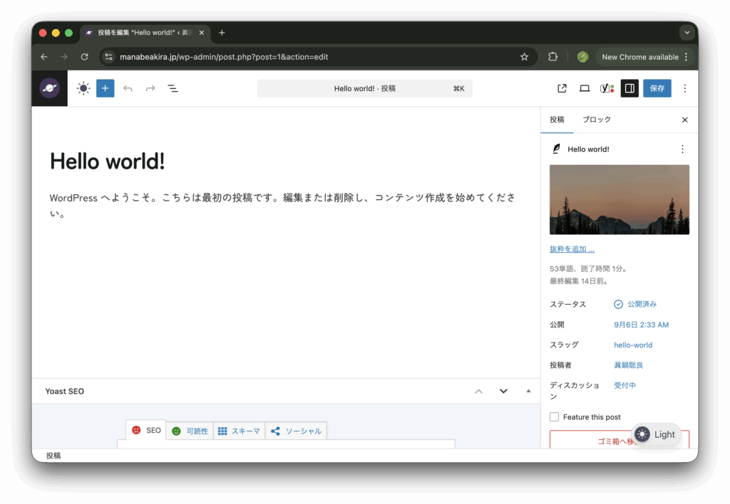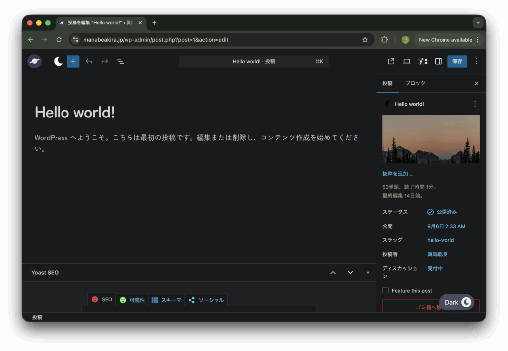 完了です。Gutenbergの投稿編集画面のビフォー&アフターをみてみましょう。右下の「Light or Dark」ボタンか左上の太陽か月のボタンを押すことでライトモードとダークモードがいつでも切り替えられます。